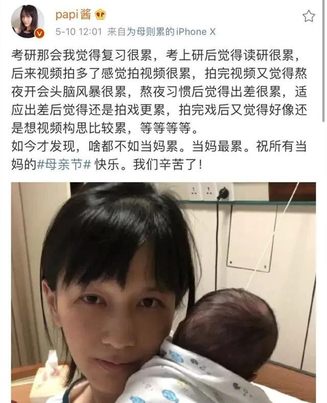 母亲节那天,很多孩子都在对自己的母亲表示感谢,有的是在朋友圈、微博表达爱意,也有的是用实际行动,比如给妈妈买康乃馨、做一顿饭或者直接转一笔钱孝敬母亲等等;也有不少妈妈感叹做母亲太不容易,其中就有初为人母的网红papi酱。